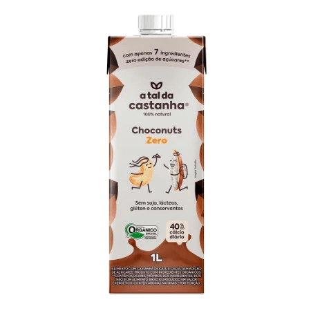 Ingredientes: água, castanha de caju orgânica, cacau em pó, cálcio (carbonato de cálcio), edulcorantes naturais: eritritol e glicosídeos de esteviol (stevia) e aroma natural.