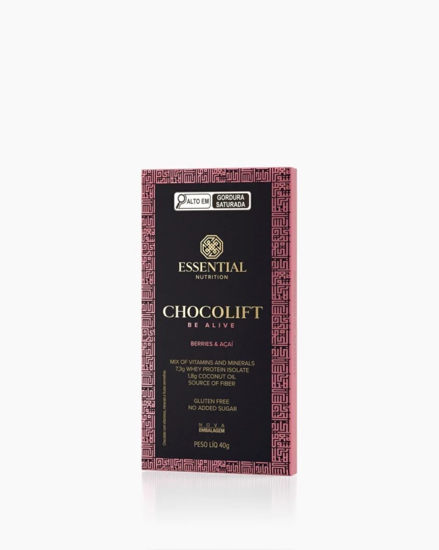 O Chocolift Be Alive sabor Berries e Açaí da Essential Nutrition é um chocolate gourmet com puro cacau belga e pedacinhos de frutas vermelhas liofilizadas, além de whey protein, óleo de coco, fibras solúveis e adoçantes naturais.